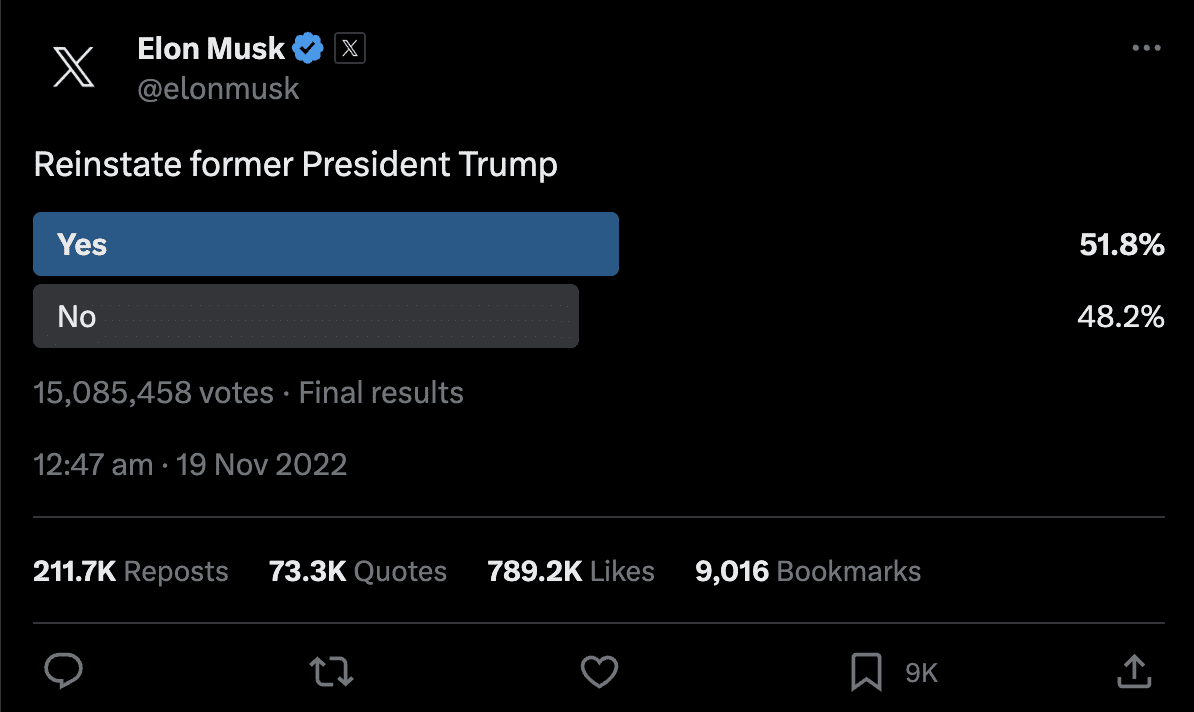 With over 15 million votes, only a slim majority were in favour of reinstating Trump’s account, with 51.8% for and 48.2% against. Hardly an overwhelming result. Interestingly, one of the people who wasn’t in favour of reinstatement was the former president himself, who said “I don’t see any reason for it” and that he would stick to his own platform Truth Social. With even former Twitterholic Donald Trump feeling disillusioned with Twitter, even Musk had to have struggled denying that the platform was rife with issues.