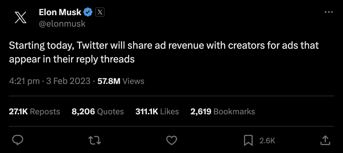 On February 3rd 2023, Musk posted:”Starting today, Twitter will share ad revenue with creators for ads that appear in their reply threads”. With the new Twitter CEO himself stating that the platform was losing over $4 million a day, it was pretty clear that this new policy of sharing ad revenue was designed to bring in more money to keep things afloat.