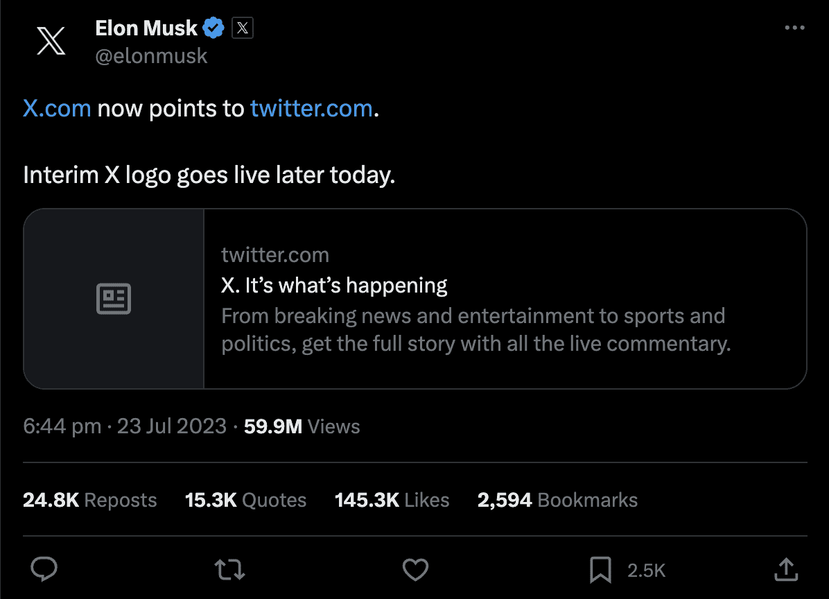 On July 23rd, Musk finally made good on his plans to rebrand Twitter as he posted: “X.com now points to twitter.com. Interim X logo goes live later today.” The billionaire has long had a bit of an obsession with the letter X, using it in everything from business names and car models to his own child’s inscrutable name. In 1999, he co-founded an online banking company called X.com, which later merged with Confinity and became PayPal. Having bought the domain from PayPal back in 2017, saying the name had “great sentimental value”, it seems that Musk had finally found the right project to take it over.
