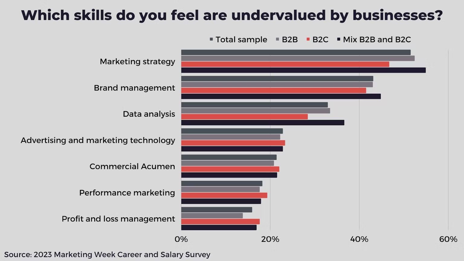 The top three skills that marketers believe organisations undervalue are marketing strategy, brand management, and data analysis, according to Marketing Week’s 2023 Career and Pay Study.