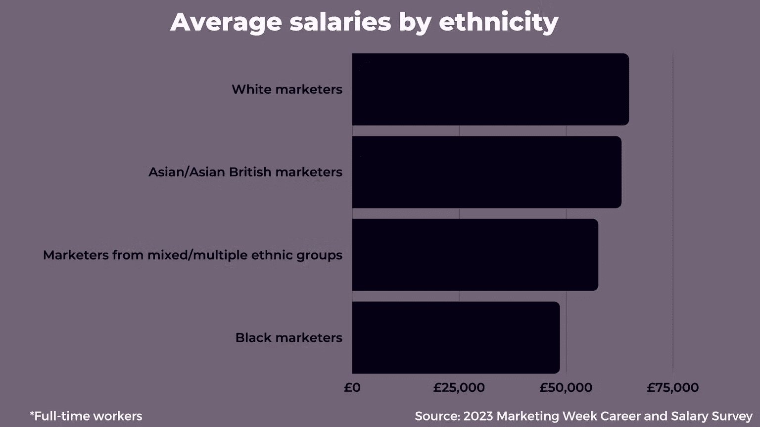 According to Marketing Week’s exclusive 2023 Career and Salary Survey, full-time marketers from ethnic minorities make 10.3% less money than their white peers on average. This number represents a small improvement over the 23.7% wage disparity that was identified in the 2022 edition.