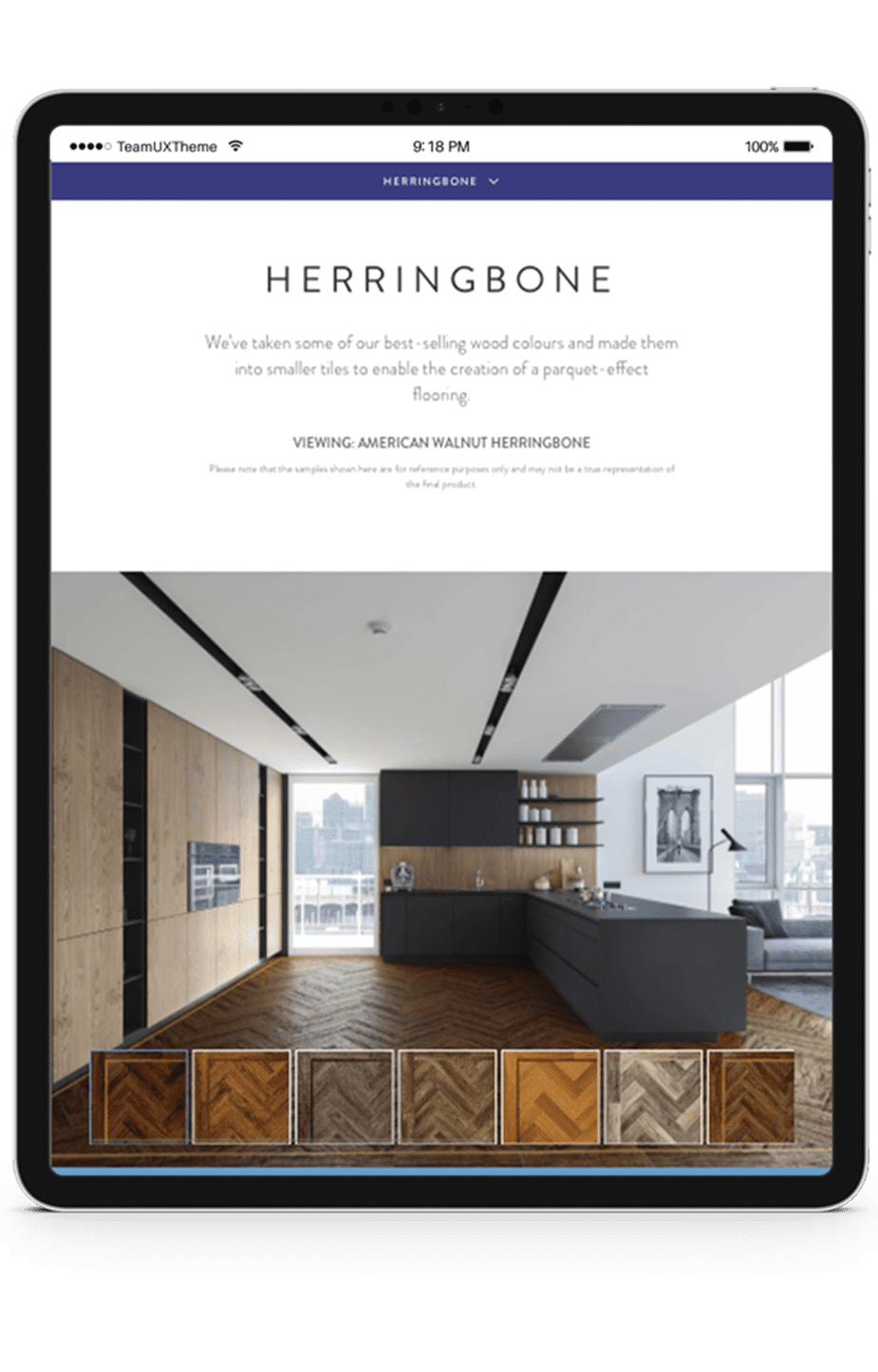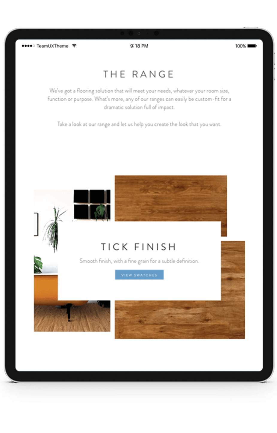 We hosted a project scoping meeting with the client where we agreed the site map, wireframes and specific requirements for functionality and interactivity. During this meeting, we suggested that we should have a whole raft of renders done for the whole product range, so when a user clicked on a swatch it would change the flooring on the render so they had an idea of what the floor would look like in the environment rather than relying on the detailed swatch alone. This idea was well received and we set about creating a fluid layout that would look great on whatever device it was viewed on without any loss of functionality.