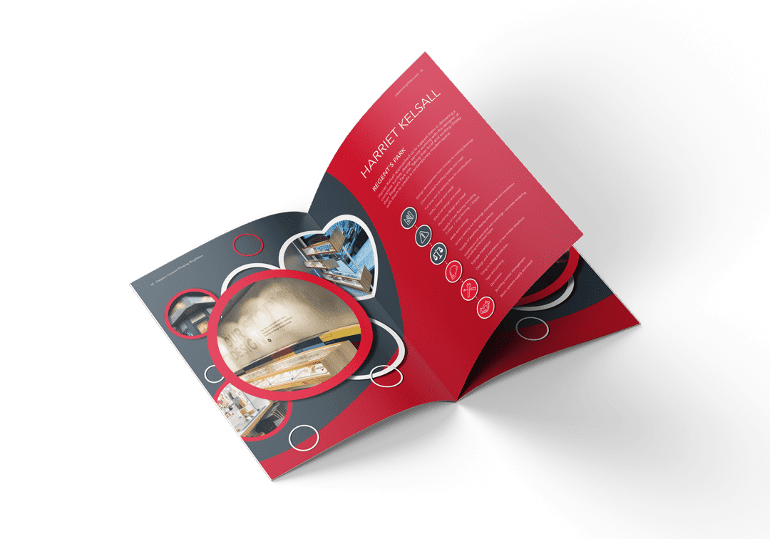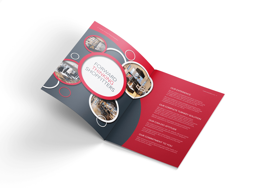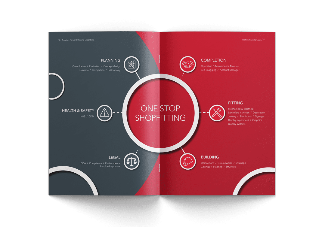 We approached the challenge with a three-stage approach. First, we established a new look and feel for the brochure built around the circles from their logo. This was then developed into a visual language system that was used as a framing device for the client’s photography. Secondly, we created a new proposition statement “Forward Thinking Shopfitters”, as the circles alluded to floating thought bubbles. With this new statement in place, we worked with the marketing team to write the copy for the brochure, including a set of case studies for Barbour, Harriet Kelsall and the Harry Potter shop at Heathrow T5. Finally, we took Creation’s six project stages, from planning through to completion, and created a “one-stop shopfitting” infographic that visualised these stages as a series of icons.